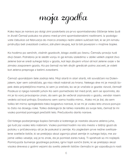 Spoznala sem, da sem dobila še eno dragoceno priložnost. Postavila so se mi nova vprašanja: » Kaj dobrega lahko naredim zase? Kaj bi me osrečevalo? Kaj lahko spremenim v svojem življenju?« In takrat sem šele zares odkrila naravo, zdravilne rastline, samonikle užitne rastline, jih začela poglobljeno raziskovati in uporabljati na mnoge načine. To me je osrečevalo. Pridobljeno znanje in ideje sem želela deliti še z drugimi, z mojo družino in prijatelji. Koristile bodo tudi njim, saj me prosijo za nasvet.