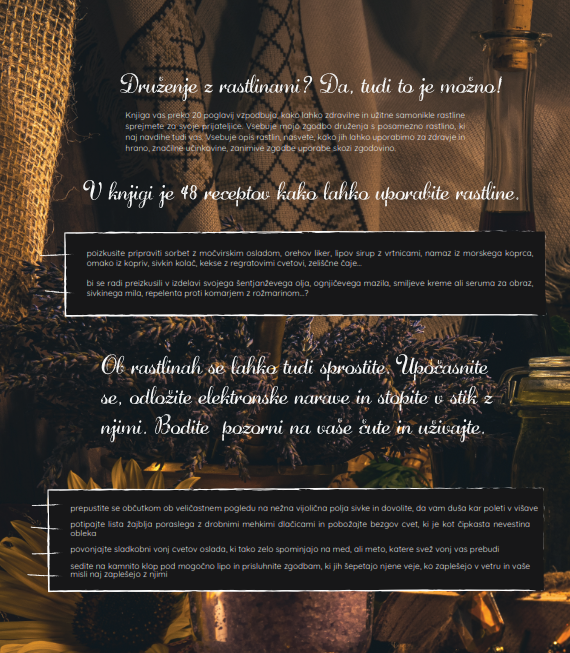 Vsebuje avtoričine zgodbo druženja s posamezno rastlino, ki naj navdihe tudi vas.