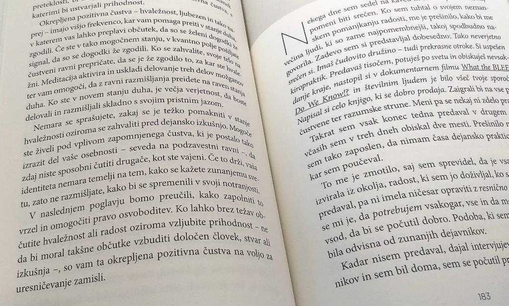 Avtor Joe Dispenza nam ponovno prinaša odličen priročnik, kjer nam razumljivo pojasni delovanje možganov in teles. Izsledki novih raziskav možganov, telesa, uma in zavesti – pa tudi kvantni skok pri našem razumevanju fizike – nakazujejo na razširjene možnosti izkoriščanja le teh.