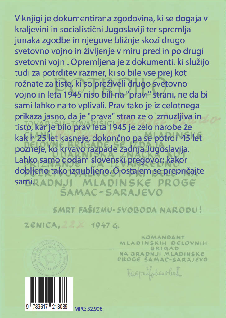 Knjiga je opremljena z dokumenti, ki kažejo nato, da razmere za tiste, ki so preživeli vojno in leta 1945 niso bili na “pravi strani” niso bile rožnate. Dokumentirana zgodovina, ki se dogaja v kraljevini in socialistični Jugoslaviji ter spremlja junaka zgodbe in njegove bližnje skozi drugo svetovno vojno in življenje v miru pred in po drugi svetovni vojni.